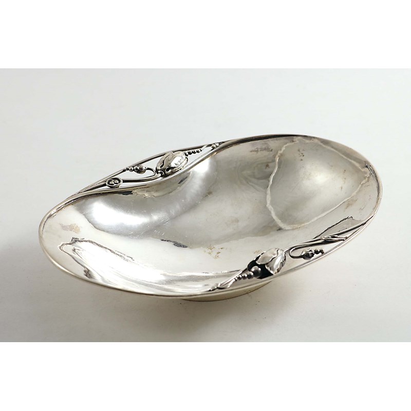 An early 20th century Danish dish of waisted oval outline with "Blossom" adornment at each side & a collet foot, by Georg Jensen, Copenhagen 1918 (incuse pattern 0.2)