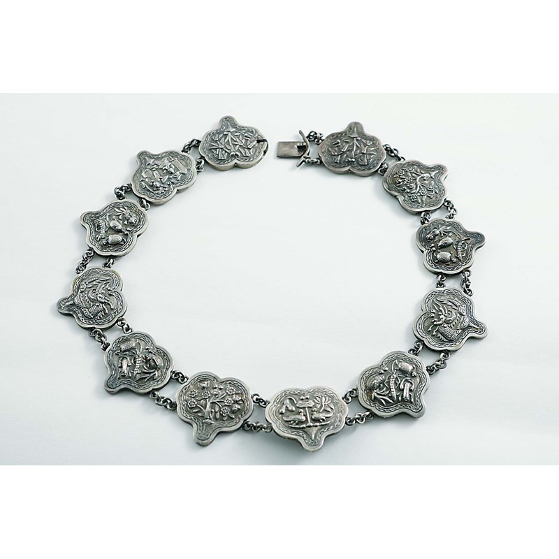 made up of twelve shaped and linked panels, each chased in relief with birds, foliage, figures, fish turtles, crab & bamboo, by Wang Hing c.1900; 16" (41 cms) long; 2.65 oz