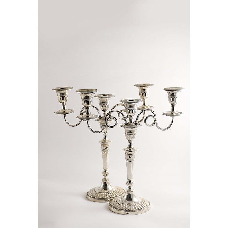with part-fluted oval bases, tapering columns and urn-shaped capitals, the reeded branches with reeded drip pans and detachable nozzles, the bases with a small presentation inscription (loaded), by Messrs. Slater, Slater & Holland, London 1896; 16" (41 cms) high; 40.8 oz (weight of branches)