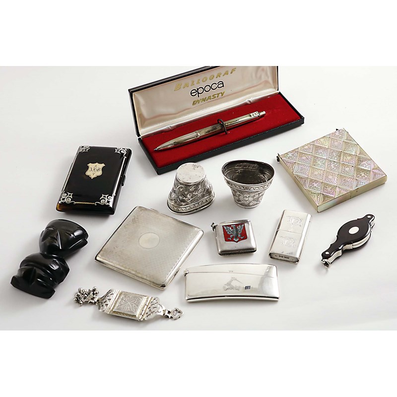 A card case, crested, Birmingham 1899, a Victorian mother of pearl card case (lacking cover), a pair of Middle Eastern eye baths, a French inlaid tortoiseshell case, an enamelled vesta case (lacking cover), a pocket lighter, initialled, a pair of mounted tortoiseshell lorgnettes, a Swedish "Ballograph" ball-point pen (cased), a small carved hardstone figure, an engine-turned cigarette case & a Middle Eastern pendant clasp with reticule and engraved calligraphy; the latter 4" (10 cms) long; 9.5 oz weighable silver (12)