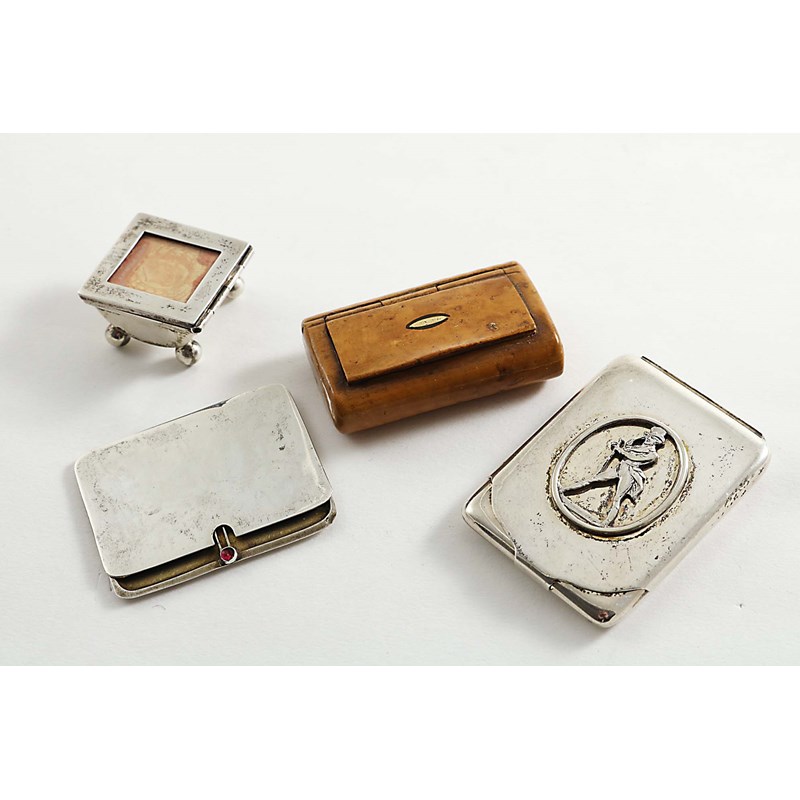 with a sliding cover & gem-set boss, by Ahronsberg Brothers, Birmingham 1910, an Edwardian stamp box on ball feet, by Levi & Salaman, Birmingham 1903, a book match holder, and a burr-wood snuff box; the latter 2.2"  (5.5 cms) long;  2.1 oz weighable silver  (4)