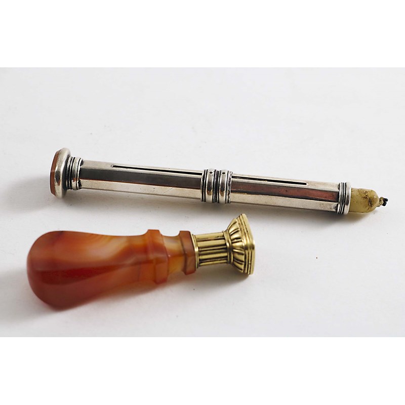 with an agate matrix & intaglio coat of arms, unmarked, and a George III seal and sealing wax holder of octagonal tubular form, the agate matrix with an intaglio portrait, maker's mark worn, Birmingham 1816; the latter 3.8" (9.5 cms) long (2)