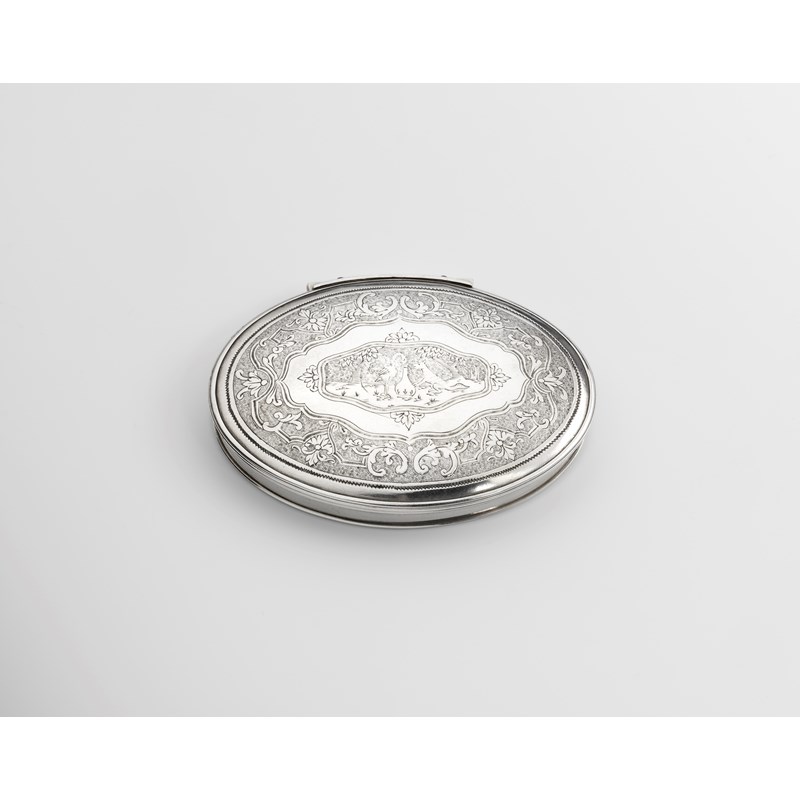 oval with a "stand-away" hinge, reed borders and a slightly dome cover, decorated with flat-chasing and centred with a scene from Aesop's Fable (The Stork & the Fox), gilt interior, maker's mark only, struck twice, probably by Jonathan Newton, London c.1720; 3.25" (8.2 cms) long; 1.75 oz