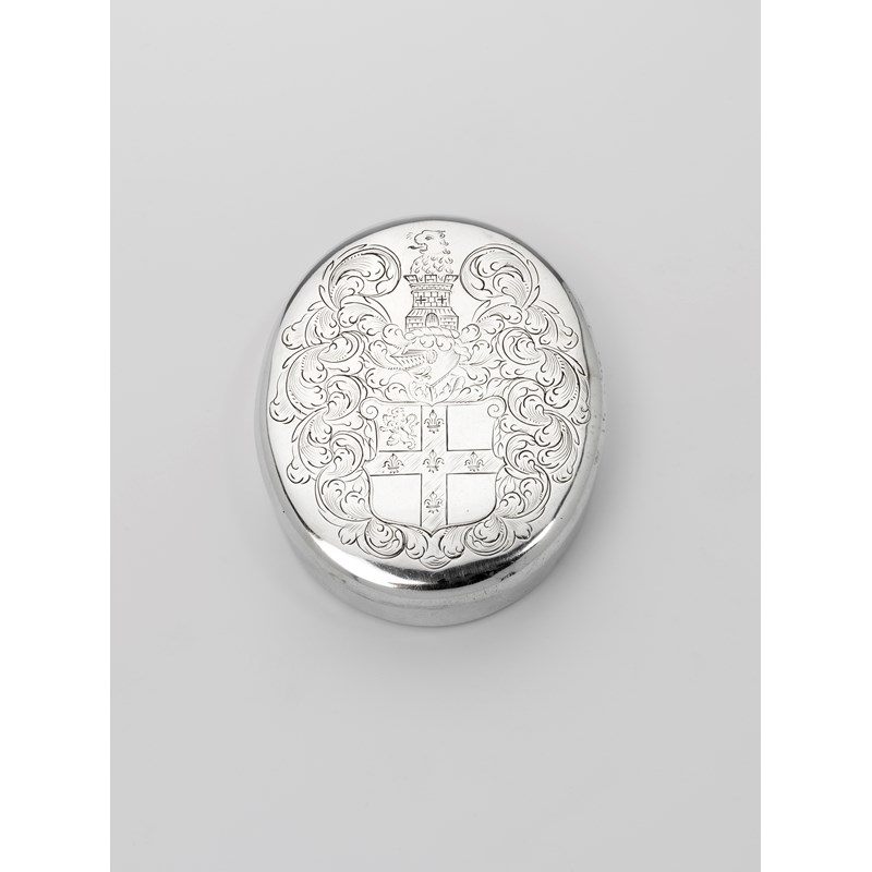 oval with a pull-off cover, engraved with a shield coat of arms* and crest, within a scrolling foliate cartouche, gilt interior, maker's mark "RS", London 1672; 3.25" (8.2 cms) long; 2.7 oz