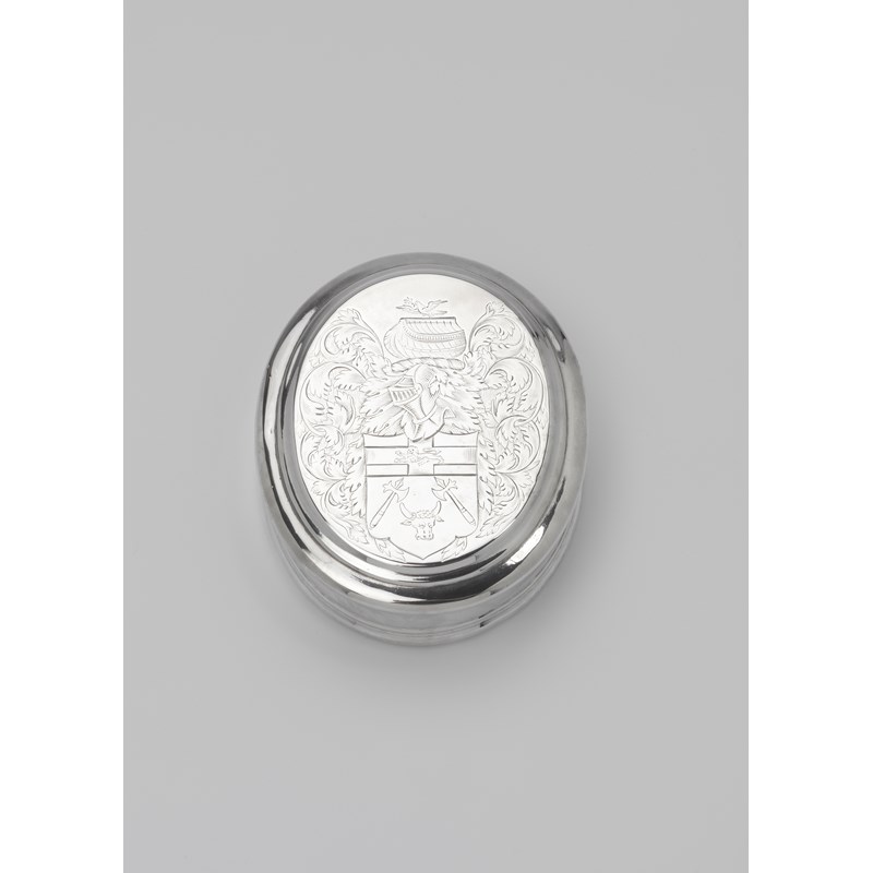 oval with moulded borders and a pull-off cover, engraved with a coat of arms & crest*, within scrolling mantling, the base inscribed "William Jigney Ex Dono. William Wainright.1713", by Edward Cornock, London 1713; 3.8" (9.7 cms) long; 4.1 oz