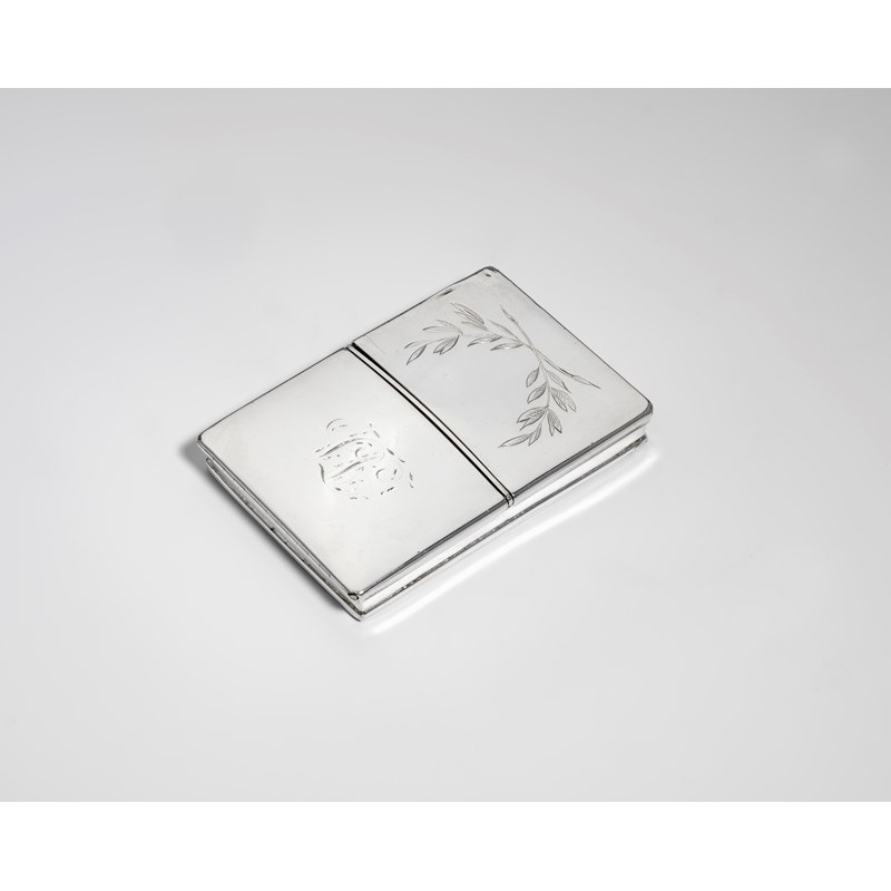 of shallow rectangular form with reeded borders and twin, hinged covers opening up from the centre, one initialled interior, by Hester Bateman, London 1788; 3" (7.6 cms) long; 2.25 oz