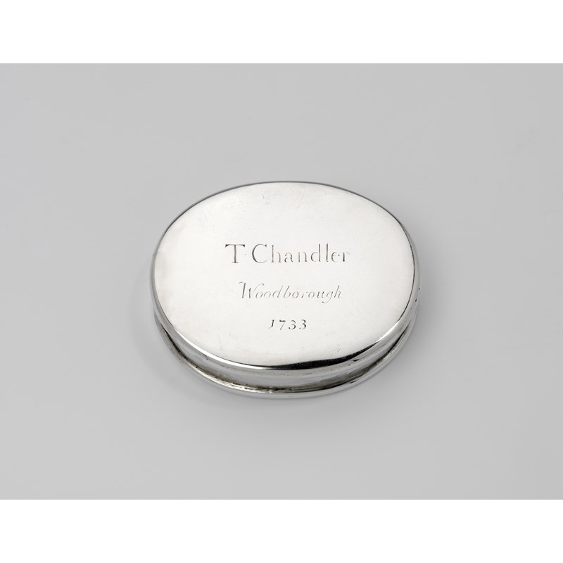 oval with plain moulded borders and a pull-off cover, inscribed "T. Chandler, Woodborough*, 1733", the base inscribed "R.S. Purtonensis me tenet Ex Dono N.N. Londinensis", maker's mark only "ID" (monogram), struck five times inside, probably West Country c.1680; 3.5" (9 cms) long; 4.25 oz