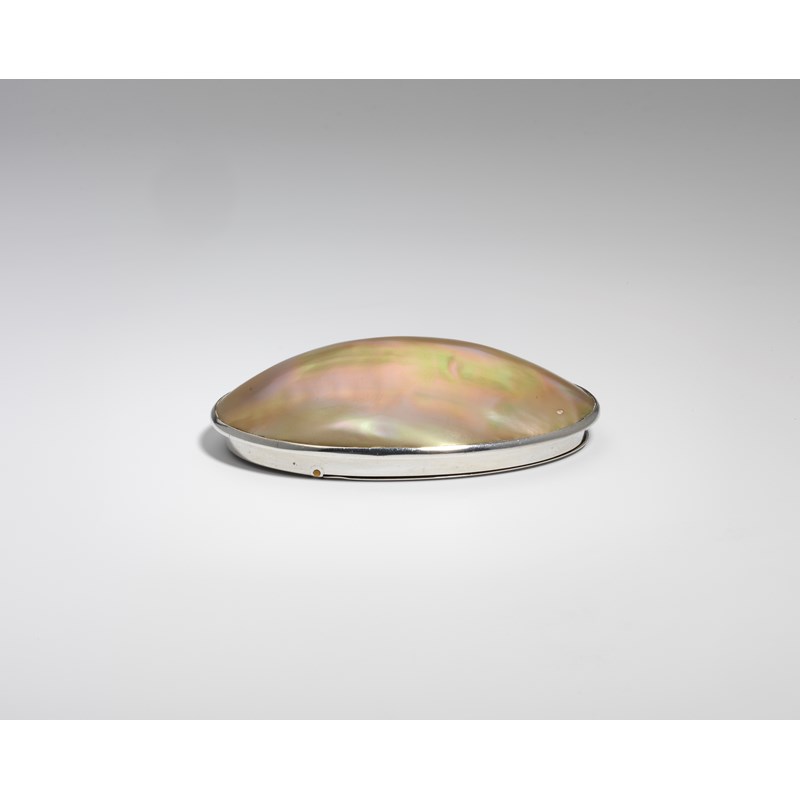 A GEORGE III / IV SCOTTISH PROVINCIAL SILVER MOUNTED MOTHER OF PEARL SHELL SNUFF BOX, oval with a pricked, Greek-key border around the cover and a central cartouche, initialled "RG" and crested, gilt interior, maker's mark only, struck once, by George Elder of Banff c.1820;  3.25"  (8.2 cms) long;  1.7 oz gross