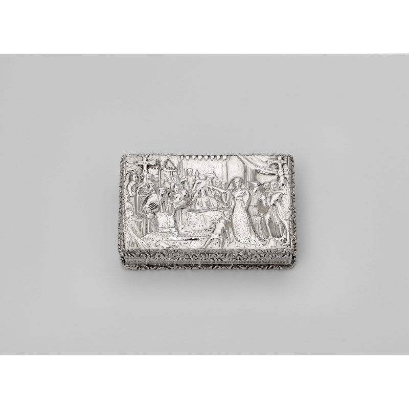 with engine-turning & raised floral borders, the cover inset with an embossed and chased plaque depicting a theatrical scene*, gilt interior, by John Bettridge, Birmingham 1828;  3.7"  (9.4 cms) long;  6.95 oz