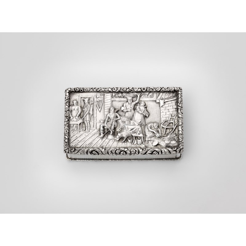 with engine-turning, raised floral borders and a vacant cartouche on the base, the cover inset with a chased and embossed plaque depicting a rustic interior scene with peasants preparing & cooking food, gilt interior, by Joseph Wilmore, Birmingham 1828; 3.55" (9.2 cms) long; 5.8 oz