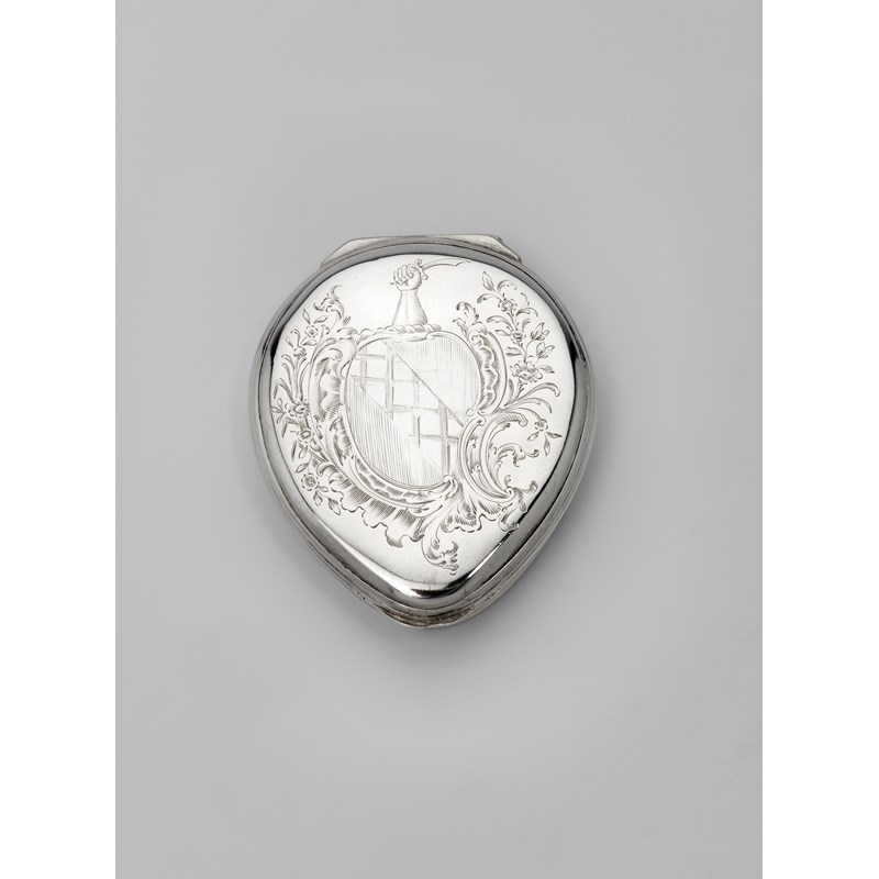 tear-drop shaped, shallow with concaved sides and reeded borders, the cover engraved with a coat of arms & crest within a rocaille cartouche, the base inscribed "Mary Hooker Dole", maker's mark only, struck once, by Benjamin Stokes, Dublin, 1750-60; 3.25" (8.2 cms) long; 2.5 oz
