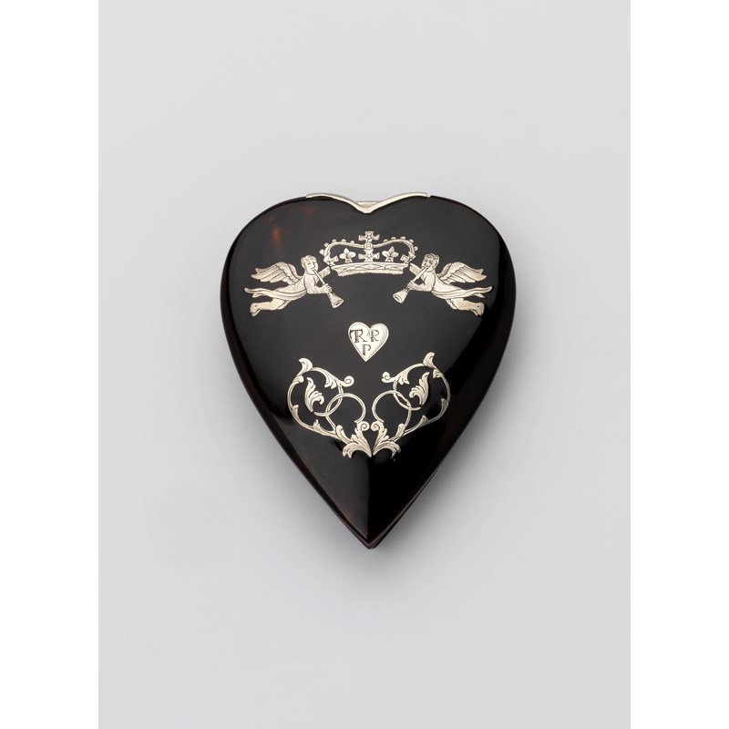heart-shaped, with a stand-away hinge and moulded borders, the cover inlaid with two herald angles supporting the royal crown above a decorative scroll and a heart-shaped cartouche, initialled "TR" conjoined and "R" over "P", unmarked, 1680-85; 3" (7.5 cms) long