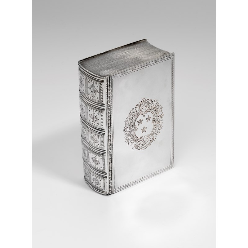 in the form of a book with an engraved spine and borders to simulate "tooling", the cover engraved with a coat of arms within a decorative cartouche, and the base engraved with a crest* by Gundry Roode, London 1731; 4.5" (11.5 cms) long; 7.9 oz