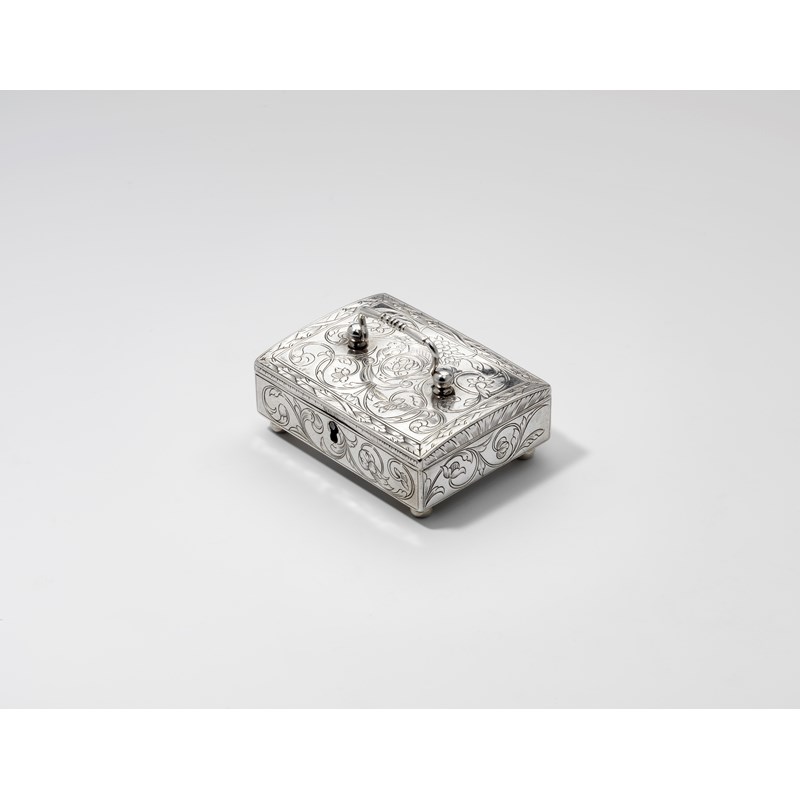 of rectangular form with engraved decoration, bun feet and a steel latch, resembling a keyhole for a lock, the base with an engraved stylised flowerhead, the slightly domed cover with a swing handle and a central oval cartouche with the cypher "DE", maker's mark only, struck once "DS" below a crown, London 1685-90; 3" (7.5 cms) long; 1.6 oz