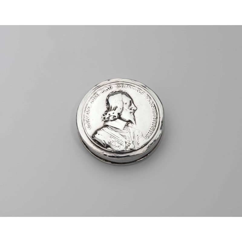 circular with a pull-off cover, stamped with a medallic portrait of King Charles I within the Latin inscription "CAROLUS.I.D.G.MAG.BRITANN.FRAN.ET.HIB.REX", the base with an engraved coat of arms*, unmarked, English 1690-1700; 2.5" (6.5 cms) diameter; 1.9 oz