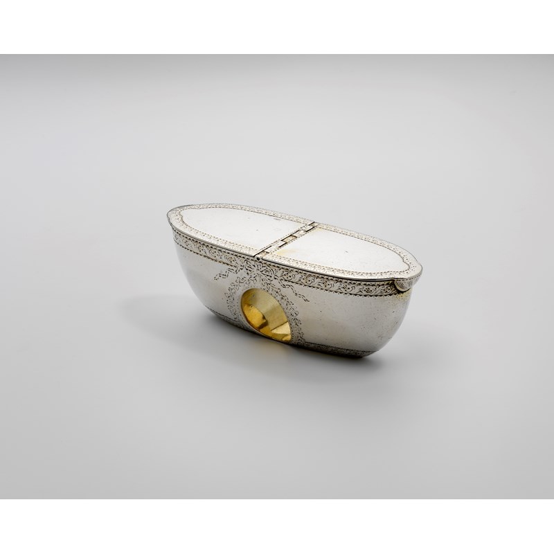 boat-shaped with engraved borders, dual compartments & traces of gilding, gilt interiors, maker's mark only struck six times "GC", possibly for George Cowdery, London c.1780; 4.2" (10.6 cms) long; 3.6 oz