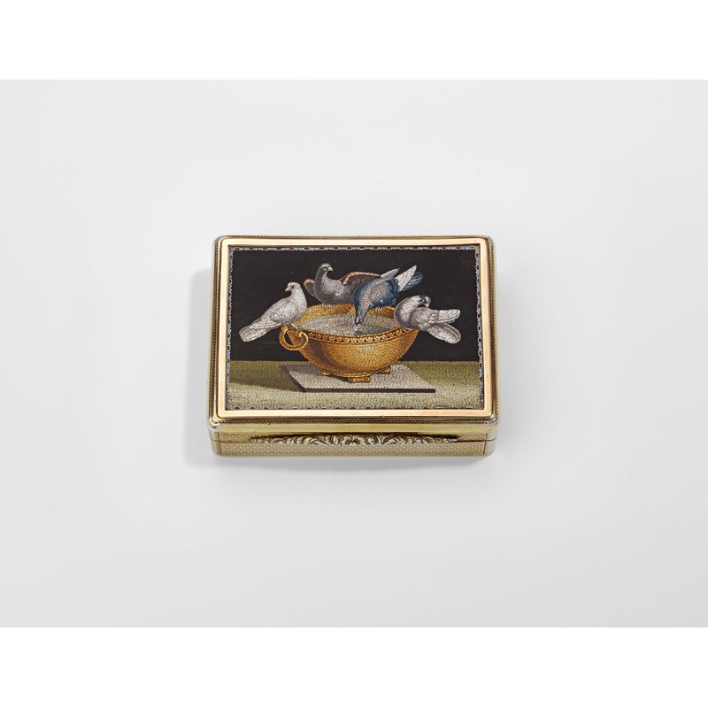 with engine-turning and a raised floral thumbpiece, the cover inset with a micro-mosaic plaque within a gold border, depicting Pliny's Doves, the gilt interior initialled "ADM from ELF Jan 1874", by Charles Rawlings, London 1828; 3.1" (7.8 cms) long; 5.8 oz gross