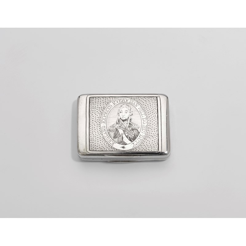 A George III silver commemorative vinaigrette, rectangular with pricked borders and the portrait of Nelson on the cover, within the legend "ENGLAND EXPECTS EVERY MAN WILL DO HIS DUTY", gilt interior, the grille stamped with a view of "HMS Victory" & TRAFR. OCT.21.1805", by Matthew Linwood, Birmingham 1805; 1.7" (4.3 cms) long; 0.9 oz