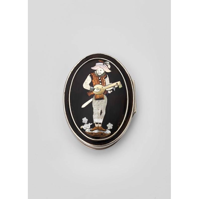 oval with a "stand-away" hinge, the cover inlaid with silver, copper and mother of pearl pieces to form the figure of Harlequin from the Commedia dell' Arte, playing a lute, flowers at his feet, unmarked, English 1720-30; 3.25" (2 cms) long