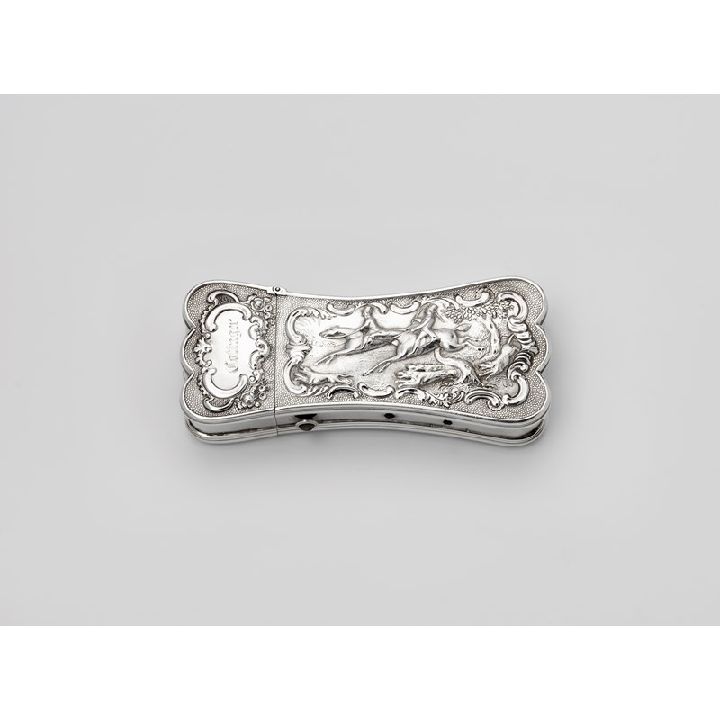 of waisted form with shaped ends and reeded borders, embossed and chased on one side with a hare coursing scene and a single greyhound within scroll borders & against a matt ground; on the other side with fox-hunting scene and the name "Cottager", with an agate-set, button thumbpress by James Barber & Co., York 1822; 4.75" (12 cms) long; 5.5 oz