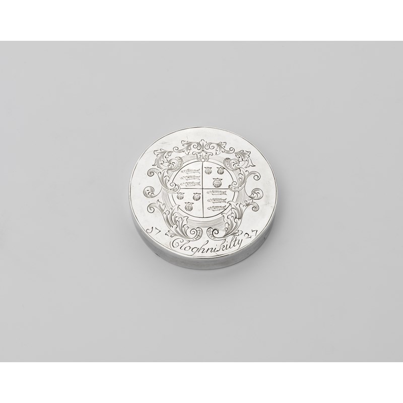 circular with a pull-off cover, engraved with a coat of arms within a circular cartouche with foliate scroll borders and above the inscription & date: "17 Cloghnikilty27", maker's mark only, struck once, by William Clare of Cork, c.1727; 2.7" 96.8 cms) diamter; 1.4 oz