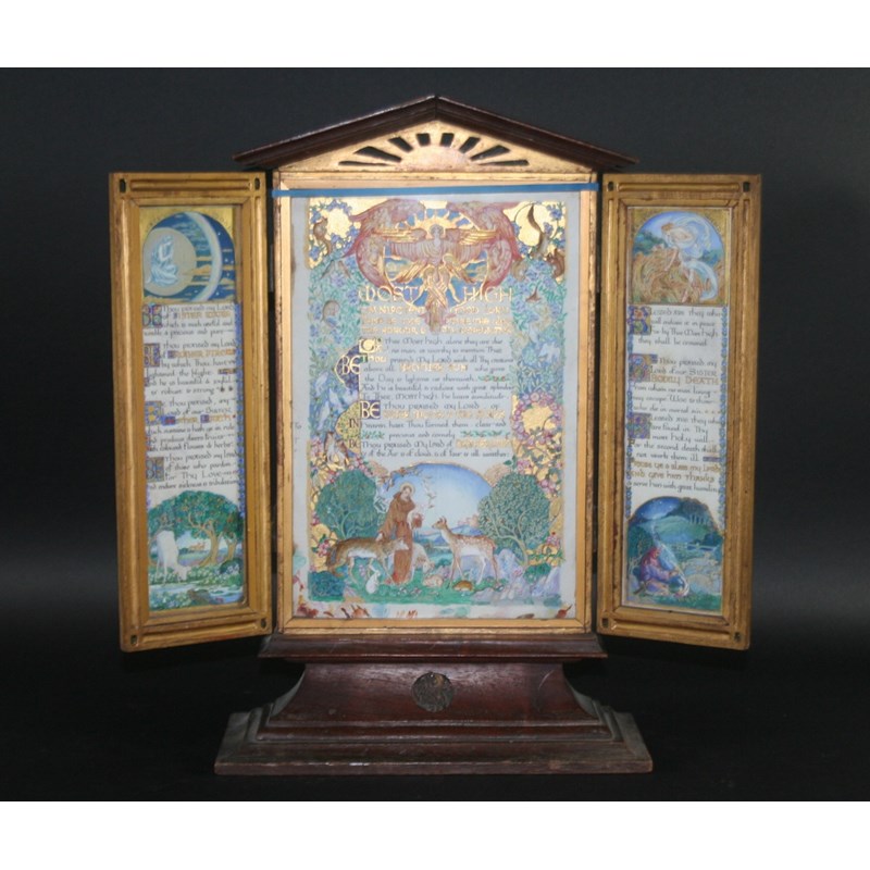 The central panel showing St Francis with animals, the left wing entitled `Sister Moon`, the right wing entitled `Brother Wind`, with prayers written in illuminated calligraphy, within its original oak frame, watercolour and gouache, central image signed