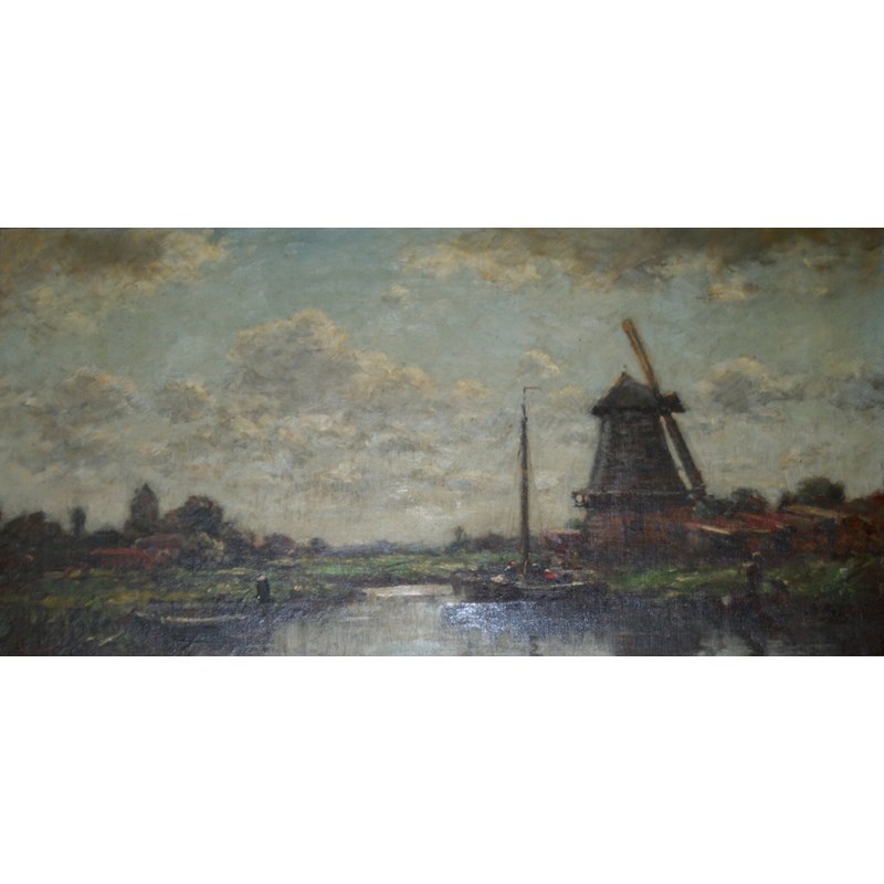 ATTRIBUTED TO EDWARD AUBREY HUNT (1855-1922) A BARGE NEAR A WINDMILL IN A LANDSCAPE Oil on canvas 35 x 70.5cm.