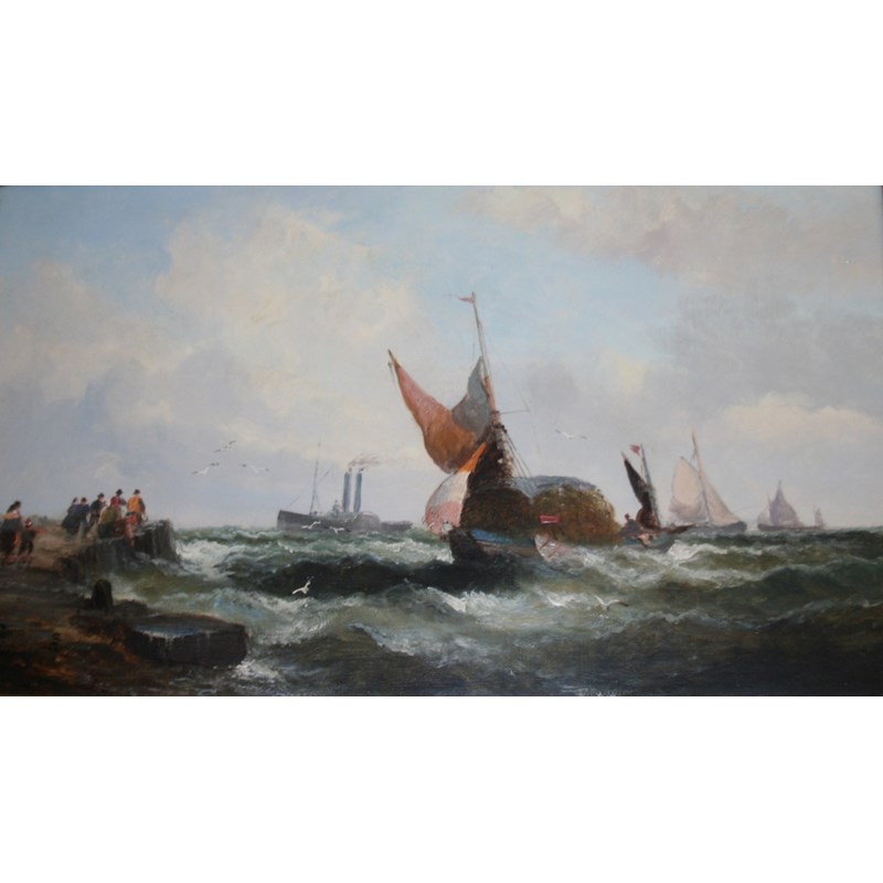 FOLLOWER OF WILLIAM THORNLEY (Fl.1858-1898) FISHING BOATS OFFSHORE; HAY BARGE AND OTHER VESSELS OFF A JETTY A pair, oil on canvas Each 29 x 49cm. (2)