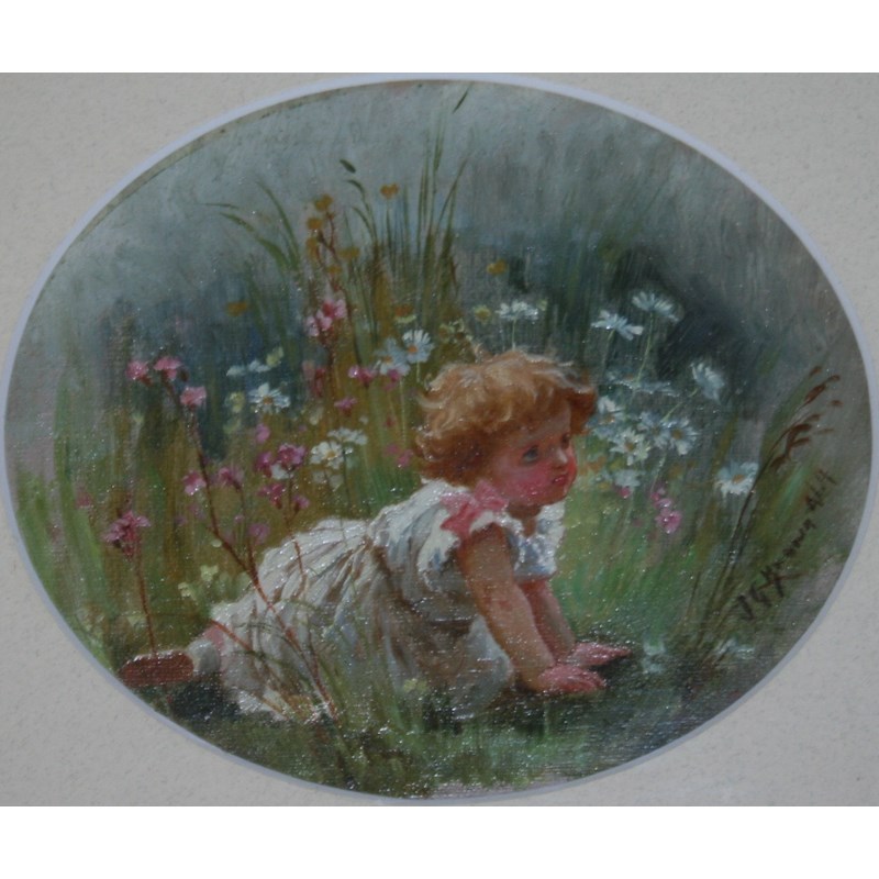 JOHN GEORGE BROWN (American, 1831-1913) THE LITTLE EXPLORER Signed and inscribed N.9 (?), oil on canvas laid on card, mounted oval 12.5 x 14cm.