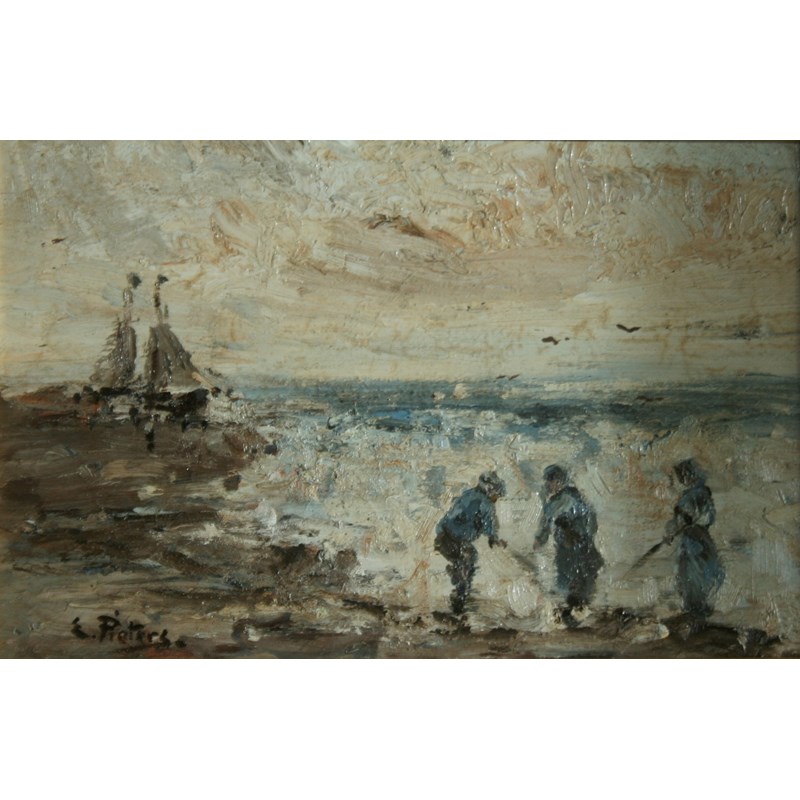 EVERT PIETERS (1856-1932) FISHERFOLK ON A BEACH Signed, oil on panel 18 x 28.5cm.