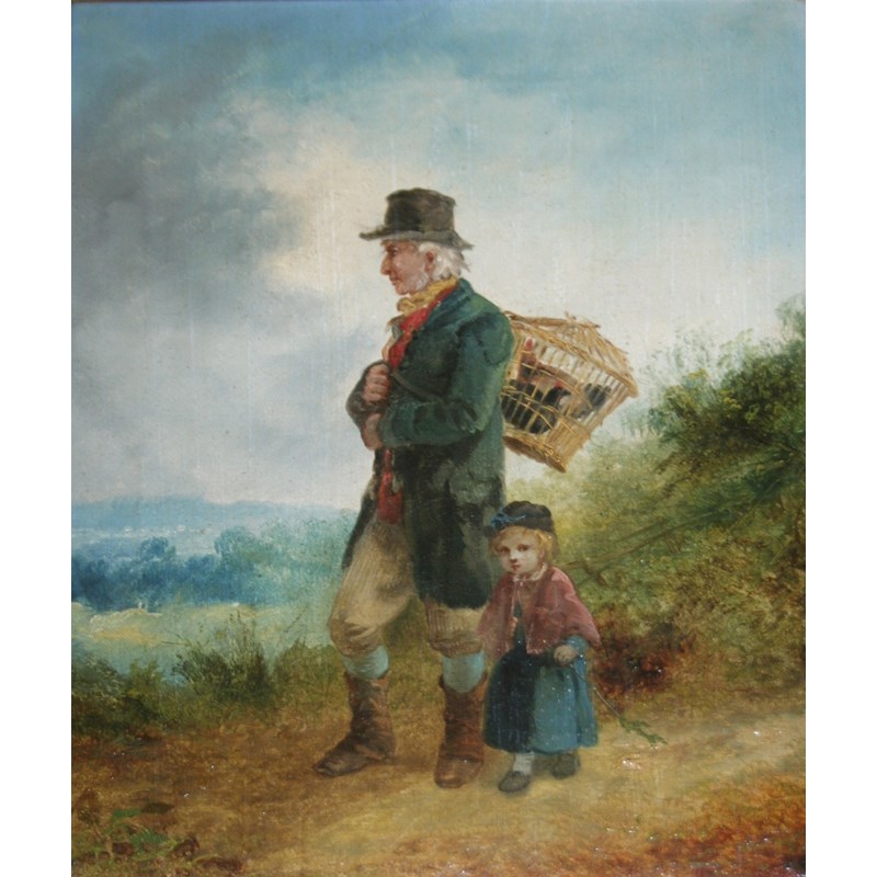 FOLLOWER OF JOHN JOSEPH BARKER OF BATH (1824-1904) THE POULTRYMAN AND HIS DAUGHTER Oil on canvas 29 x 24cm.