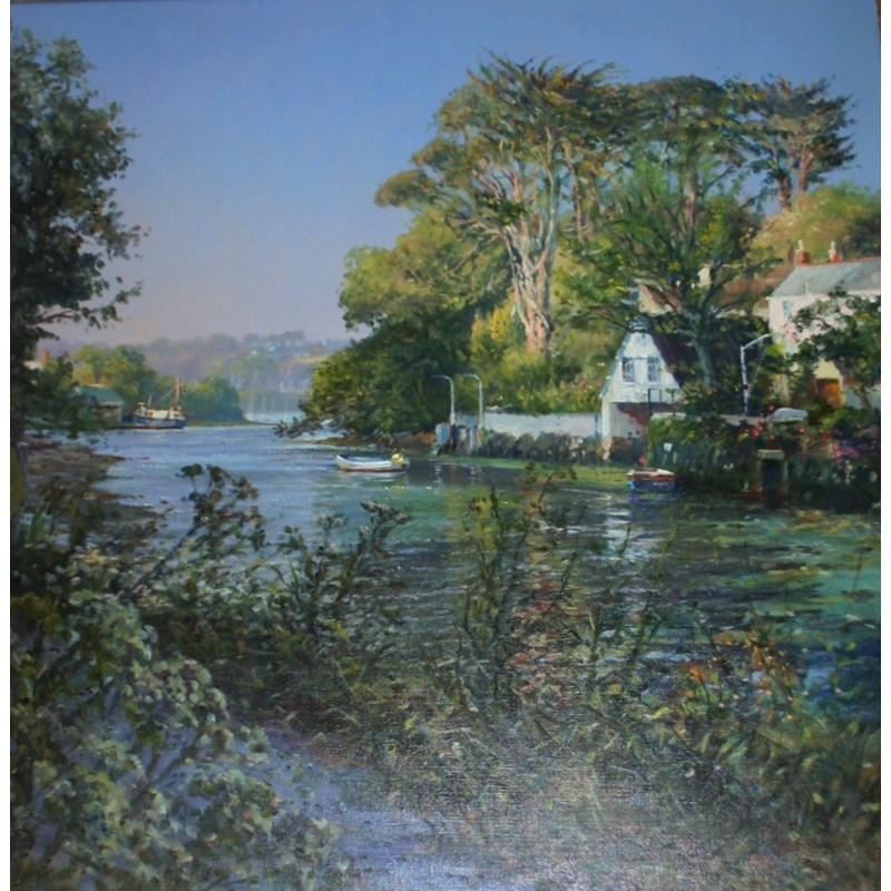 ‡TED DYER (b.1940) SUMMER EVENING, HELFORD Signed, inscribed with title on stretcher, oil on canvas 75 x 75cm Provenance: Falmouth, Beside The Wave Gallery, `Cornish Colours` Exhibition, from whom purchased September 2000