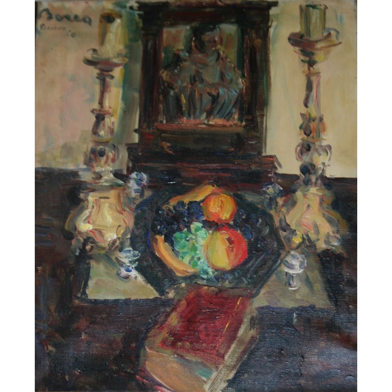 ‡DEMETRE DE BEREA (1908-1975) STILL LIFE IN AN INTERIOR Signed, inscribed indistinctly and dated 50, oil on canvas 45.5 x 37.5cm.