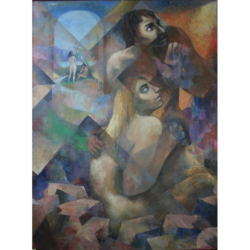 ‡CHRISTINE NISBET (1902-1990) `TWENTIETH CENTURY 1b`: ADAM AND EVE Signed, bears typed label on stretcher, oil on canvas, lath frame 101 x 76cm.