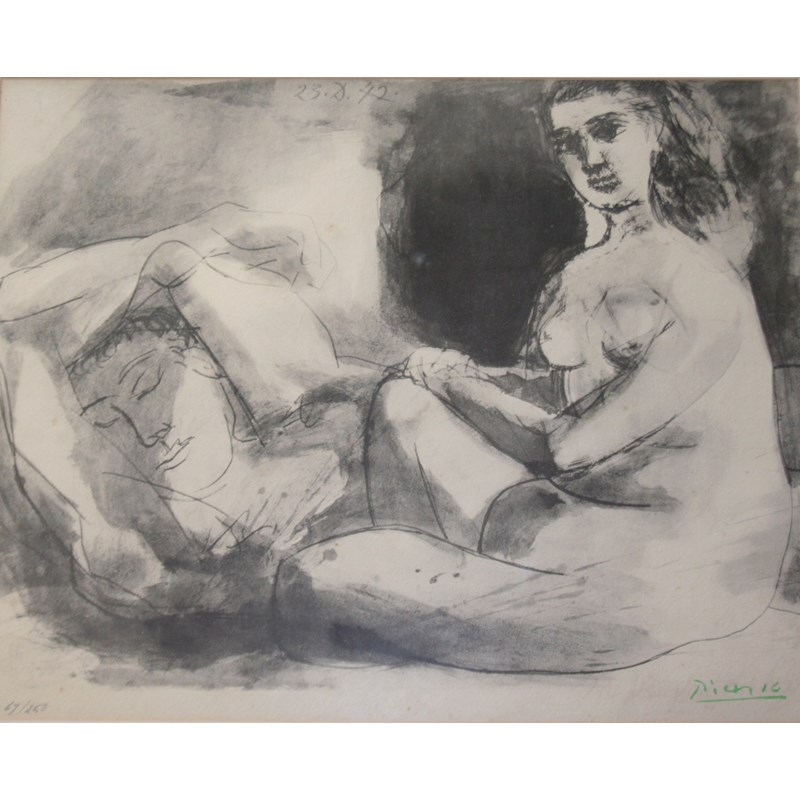 ‡AFTER PABLO PICASSO (1889-1973) HOMME COUCHE ET FEMME ASSISE (23.8.42) Photogravure, bears signature in green gouache, numbered 67/250 40.5 x 51cm.