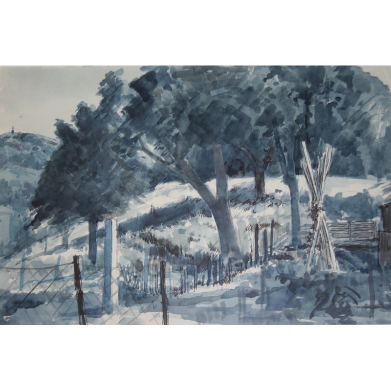 to comprise `Figure Studies` by Viola Paterson, pencil, 16 x 20.5cm.; `Street Scene, Ilchester` by Roland Batchelor, ink and wash, 17 x 23.5cm.; `Cannes` by Charles Cundall, watercolour and pencil, 15.5 x 24.5cm.; `Quite Optional` by Adrian Hill, signed, charcoal, 19 x 25cm.; and `Trees` by Frank Runacres [see illus], ink and wash, 25 x 38cm.; all unframed (5)