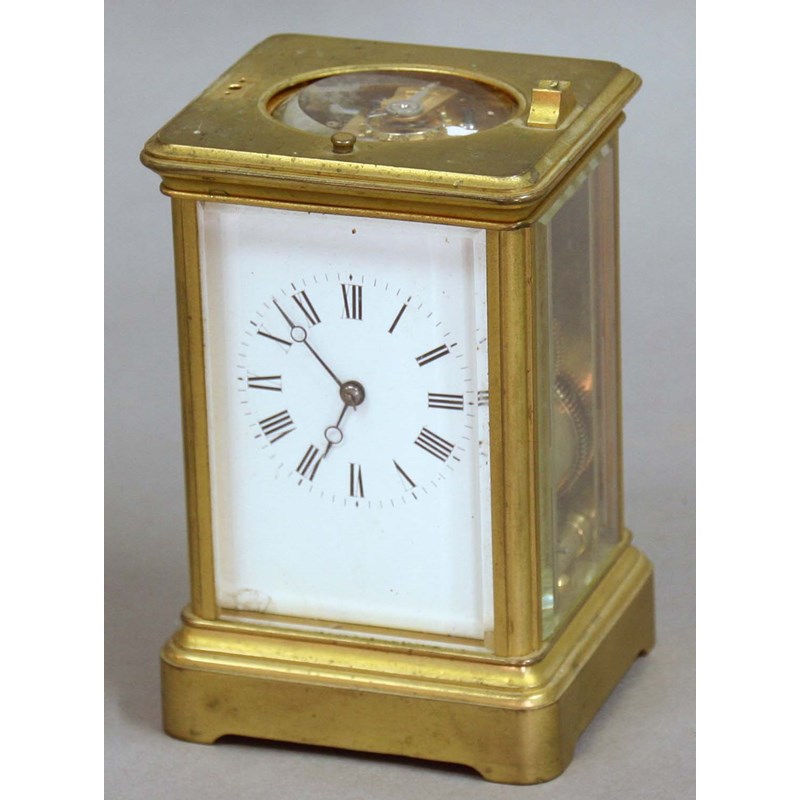 BRASS FOUR PANE CARRIAGE CLOCK the white enamel dial on a repeating, eight day movement with half hourly strike to a gong, with carry case, height excluding handle 13cm