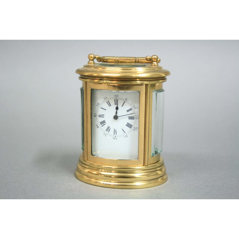 FRENCH GILT BRASS OVAL FOUR PANE CARRIAGE TIME PIECE, with brass eight day movement, height excluding handle 7.5cm