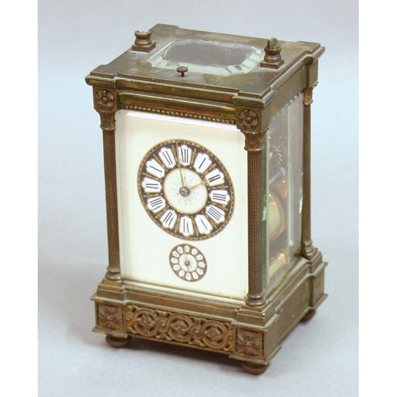 the enamelled face with French style numerals to the main and alarm dials, on an eight day half hourly striking brass movement with repeater and alarm mechanisms, in a case with Corinthinan column corners and blind fret work panel to the front, height excluding handle 16cm
