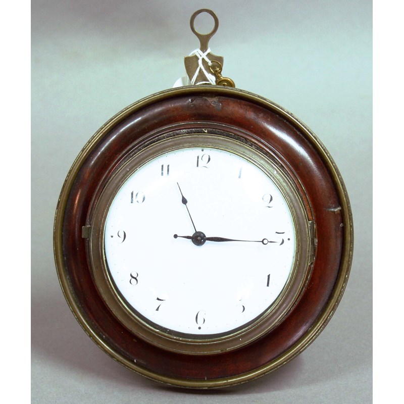 REGENCY SEDAN CLOCK, the 4" enamelled dial with arabic numerals in a mahogany and brass circular frame on a gilt brass movement inscribed 'M Patrick, Greenwich, No. 282', 16cm diameter