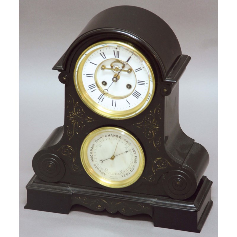 late 19th century, with 5 1/2" enamelled dial with exposed escapement and brass eight day movement striking to a bell, above a 4 1/2" aneroid barometer house in a domed black marble case, 43cm