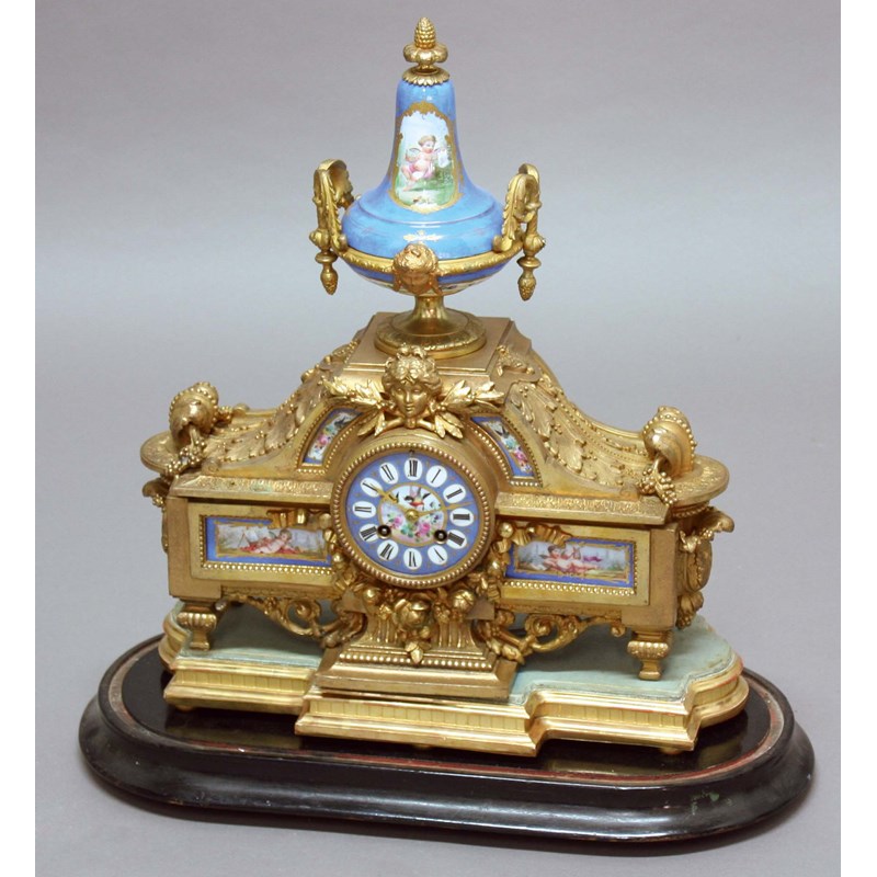 the dial painted with a central floral and bird roundel,on a brass movement striking to a bell, in a case surmounted by an urn, the whole with Sevres style plaques, height 43cm; together with a giltwood plinth and glass dome