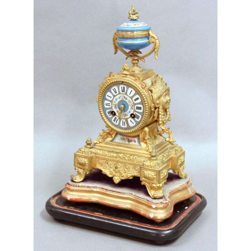 late 19th century, the 3" porcelain dial on a brass movement inscribed Hy Marc and striking to a bell, the case with porcelain urn finial, mask heads and stepped base, height excluding stands 31cm