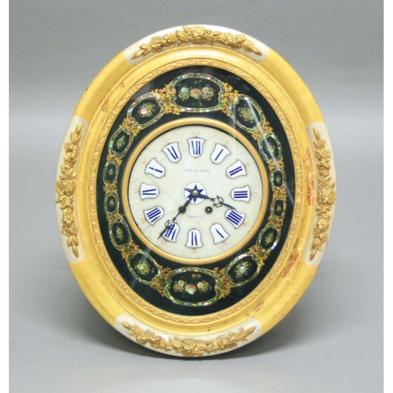 9 1/2" alabaster dial, inscribed Sarl & Sons, Cornhill, with enamelled numerals inside a mother of pearl inlaid border and silvered and gilt oval frame, on a brass two train striking movement, height 60cm, width 50cm