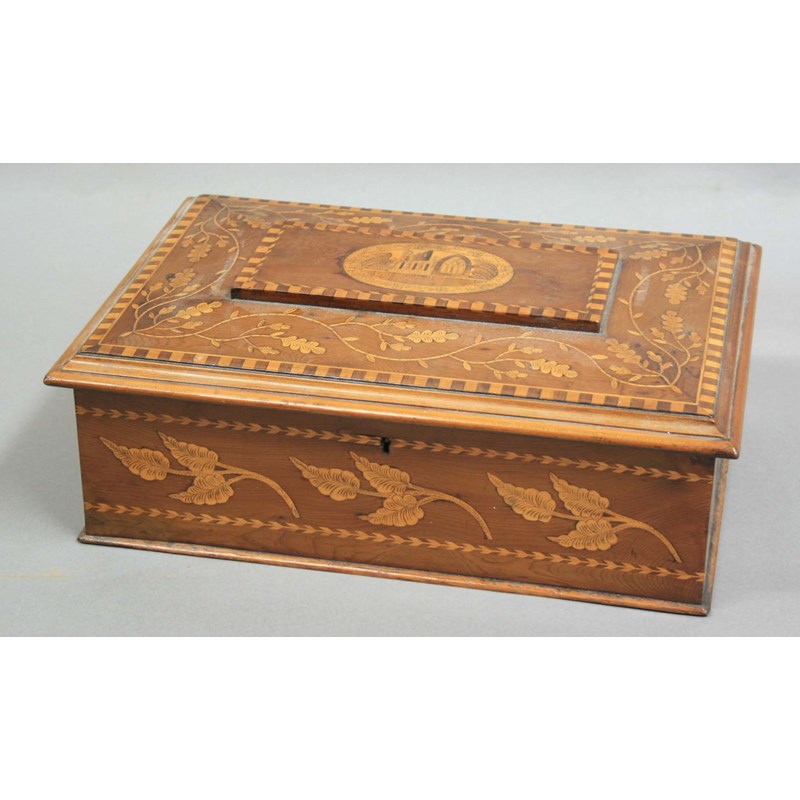 of shallow sarcophagus form, inlaid with a ruined church, scrolling oak leaves and acorns and foliage, the interior with an Irish harp amongst shamrocks, width 34.5cm
