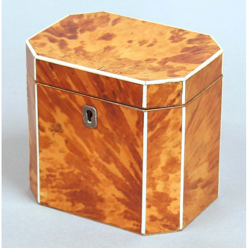 GEORGE III BLOND TORTOISESHELL TEA CADDY, of canted rectangular form with ivory edging, width 11.5cm