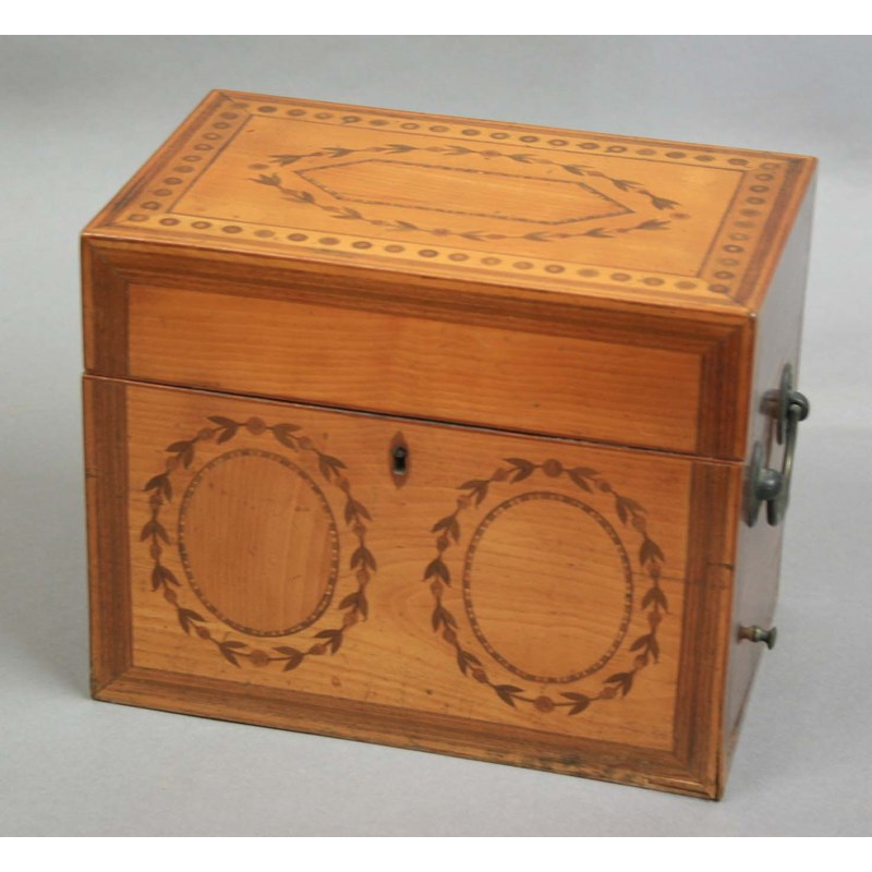 with harebell and 'jewel' inlay to the top and wreaths to the front, the fitted interior retaining six glass bottles and stoppers, two brass swing handles, width 23cm