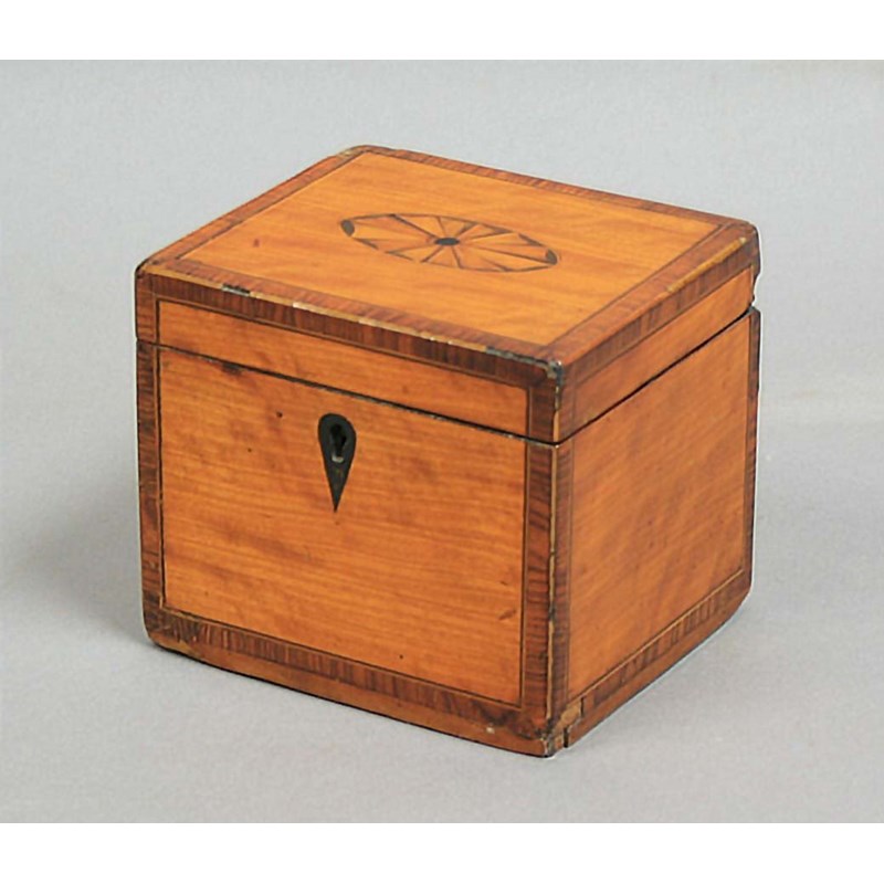 REGENCY SATINWOOD AND INLAID TEA CADDY, of near cube form, the cover with inlaid patera, rosewood crossbanding and ebonised escutcheon, width 12cm