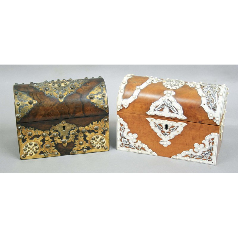 the first walnut with pierced ivory mounts, the second walnut with brass and bone mounts, each with fitted interiors, 22cm and 19cm wide (2)
