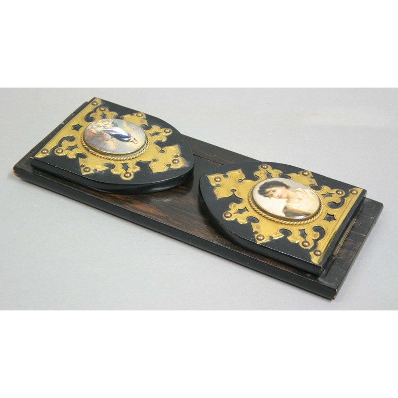 VICTORIAN EBONISED SLIDING BOOK RACK, continental porcelain figural plaques on gothic gilt metal mounted, width closed 33cm